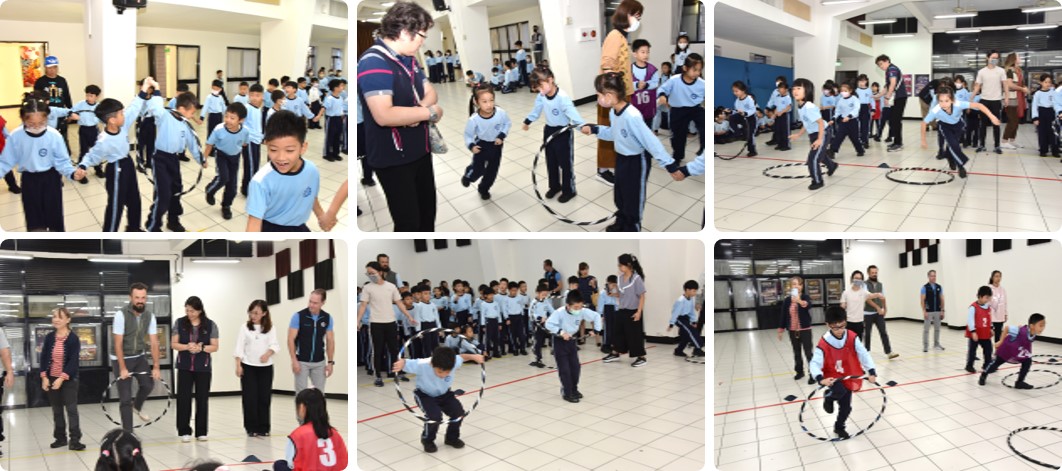 本次活動設計兩個關卡。第一關為團隊合作動作,全班同學牽手站成一列,讓呼拉圈依序通過手腳,直到最後一位同學將呼拉圈送至指定角標位置;第二關為折返挑戰,每位學生需輪流穿越呼拉圈一次,可採跳繩式跳躍動作進行。透過兩項兼具趣味性與挑戰性的任務,考驗學生的默契、身體協調能力與團隊合作精神,以完成全程時間最短的班級獲勝。
