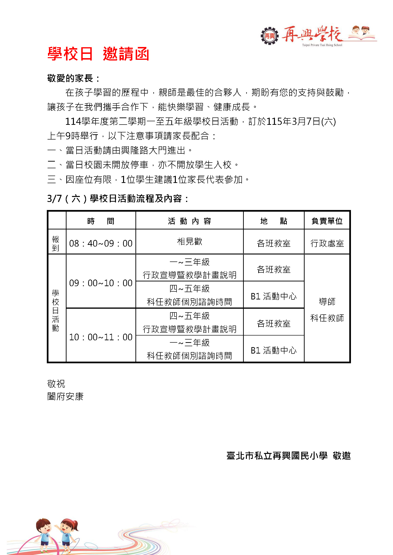 誠摯邀請一~五年級家長參加114學年度第二學期學校日活動,