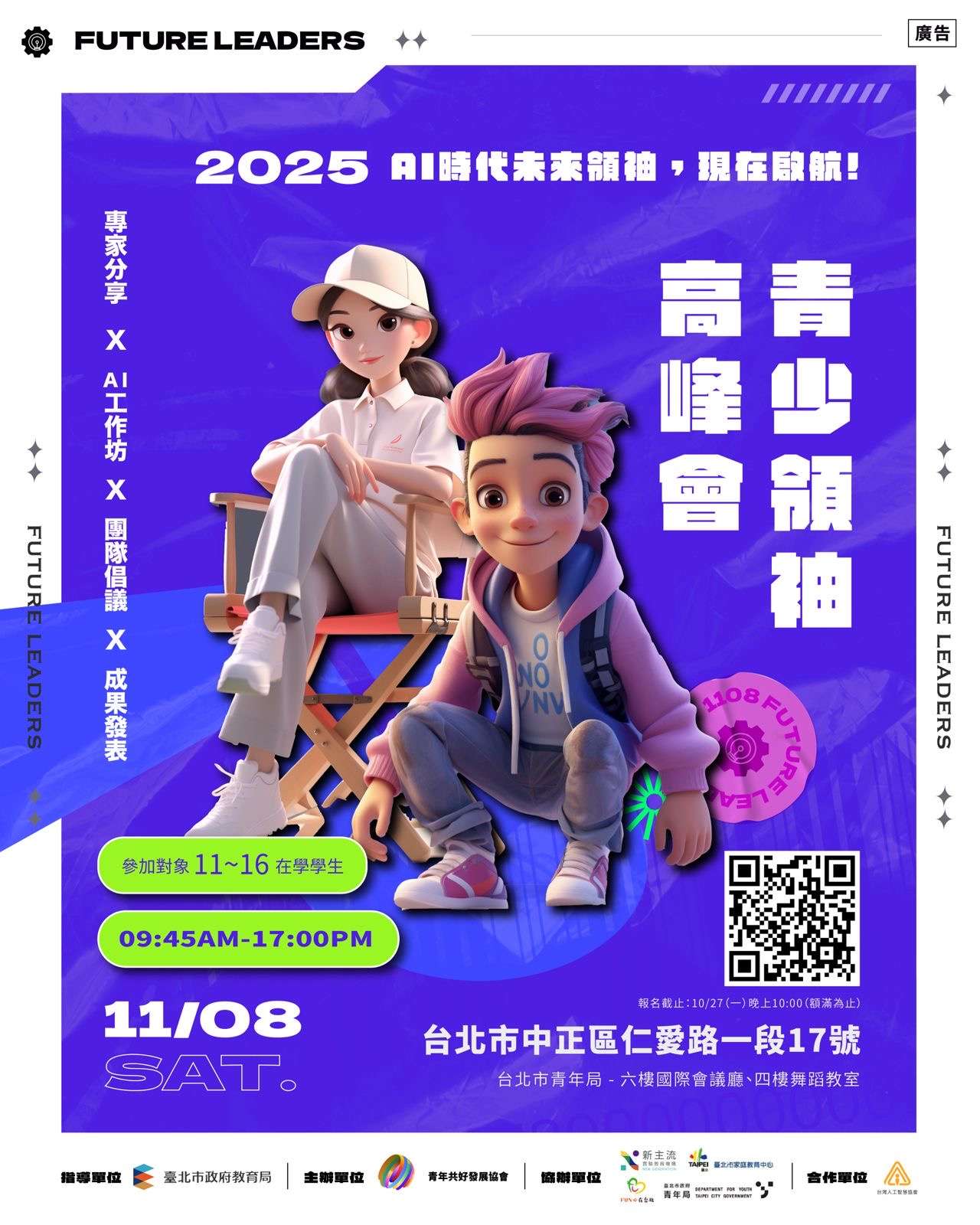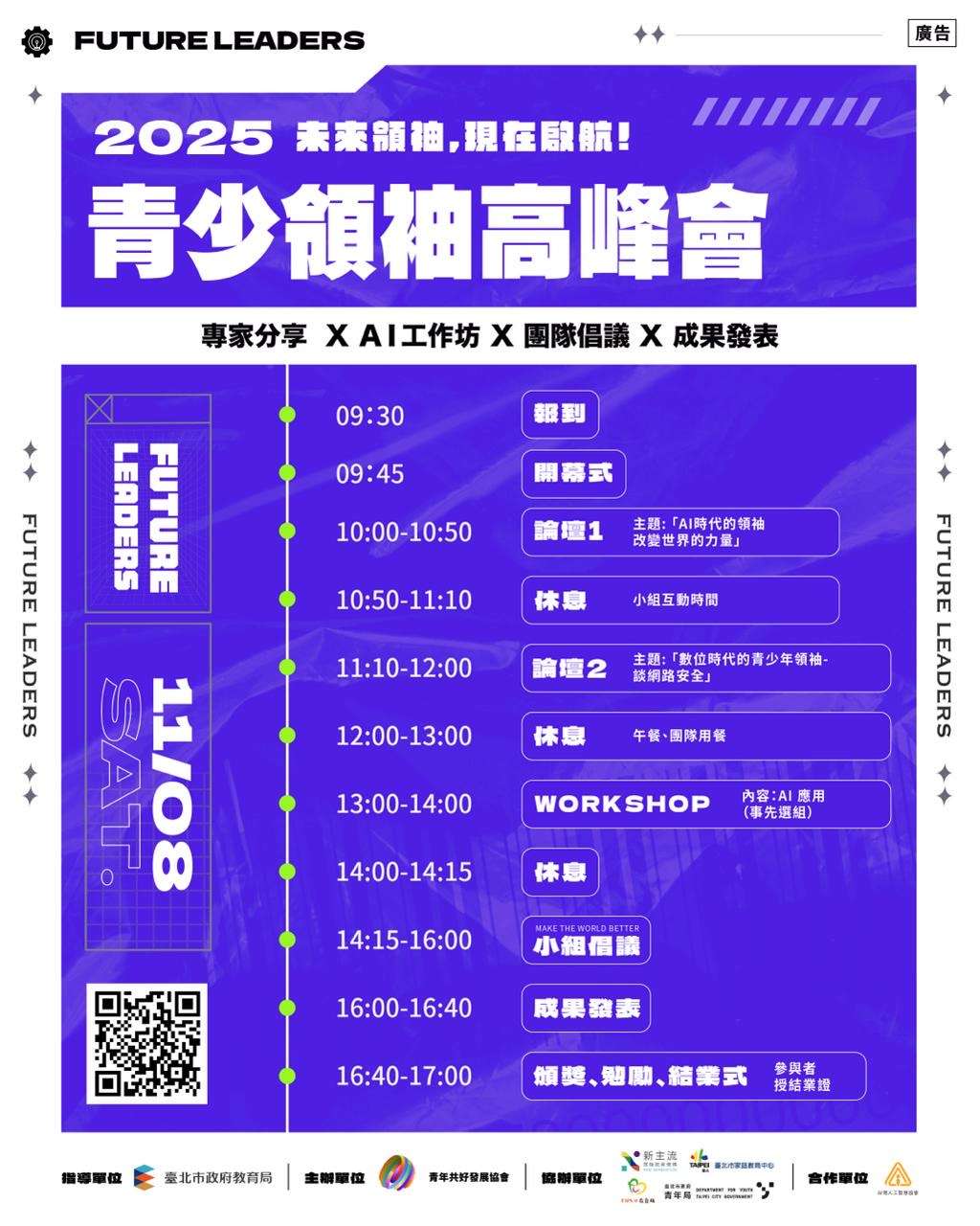 財團法人臺北市青年共好發展協會 2025少年領袖高峰會 一、依據財團法人臺北市青年共好發展協會114年8月28日共好字20250828號函辦理。 二、旨揭活動旨在引導少年瞭解AI趨勢,提升社會與國際視野並協助孩子找到自我價值、穩健成長。相關報名資訊如下 (一)參加對象:11至16歲之在學學生。 (二)時間:114年11月8日(星期六)上午9時45分至下午5時。 (三)地點:臺北市政府青年局6樓國際會議廳。 (四)報名期限:即日起至10月27日(額滿為止)。 (五)報名網址:https://reurl.cc/WOZ9b9 三、本活動報名相關事宜,請逕洽臺北市青年共好發展協會林先生,聯絡電話:0932-011433,聯絡信箱:Nskids2014@gmail.com。 四、檢附「2025少年領袖高峰會實施計畫」1份及活動DM2份。 |