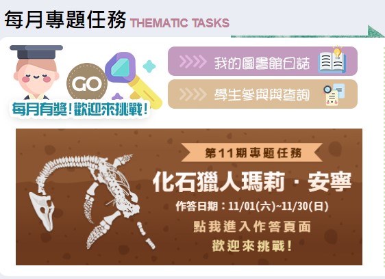★114年第11期專題任務主題為「化石獵人─瑪莉‧安寧」,請學生踴躍上網參加,