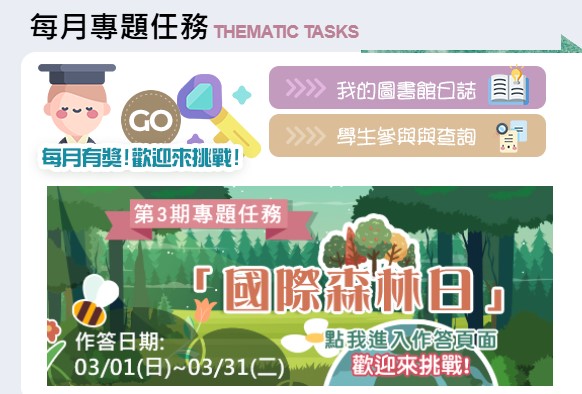 ★115年第3期專題任務主題為「國際森林日」,請學生踴躍上網參加,