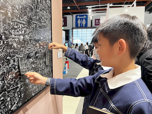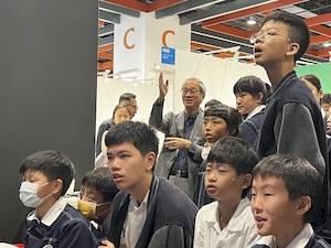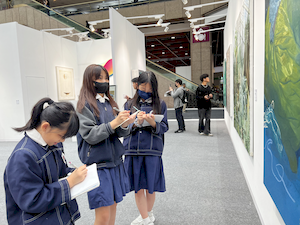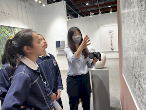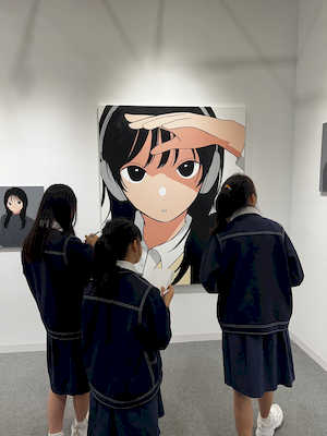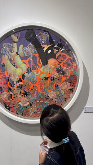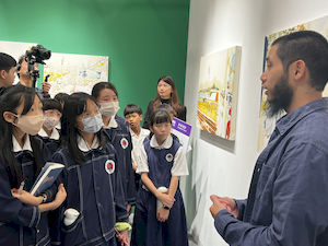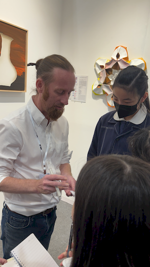 參觀的腳步裡,學生有的拿起素描本記錄靈光,有的主動與來自日本、韓國、荷蘭的藝術家對談。藝術家們熱情地回應——有人用手電筒照亮雕塑的紋理變化,老師邀請孩子用手機與肉眼比較拼貼畫的立體層次,也有人遞出圖卡讓他們尋找畫作中的隱密細節。有人乾脆取下作品示範,或在學生的筆記本上簽名留念。那一刻,藝術不再高懸於牆,而是溫柔的伸出手,成為可親可近的朋友。