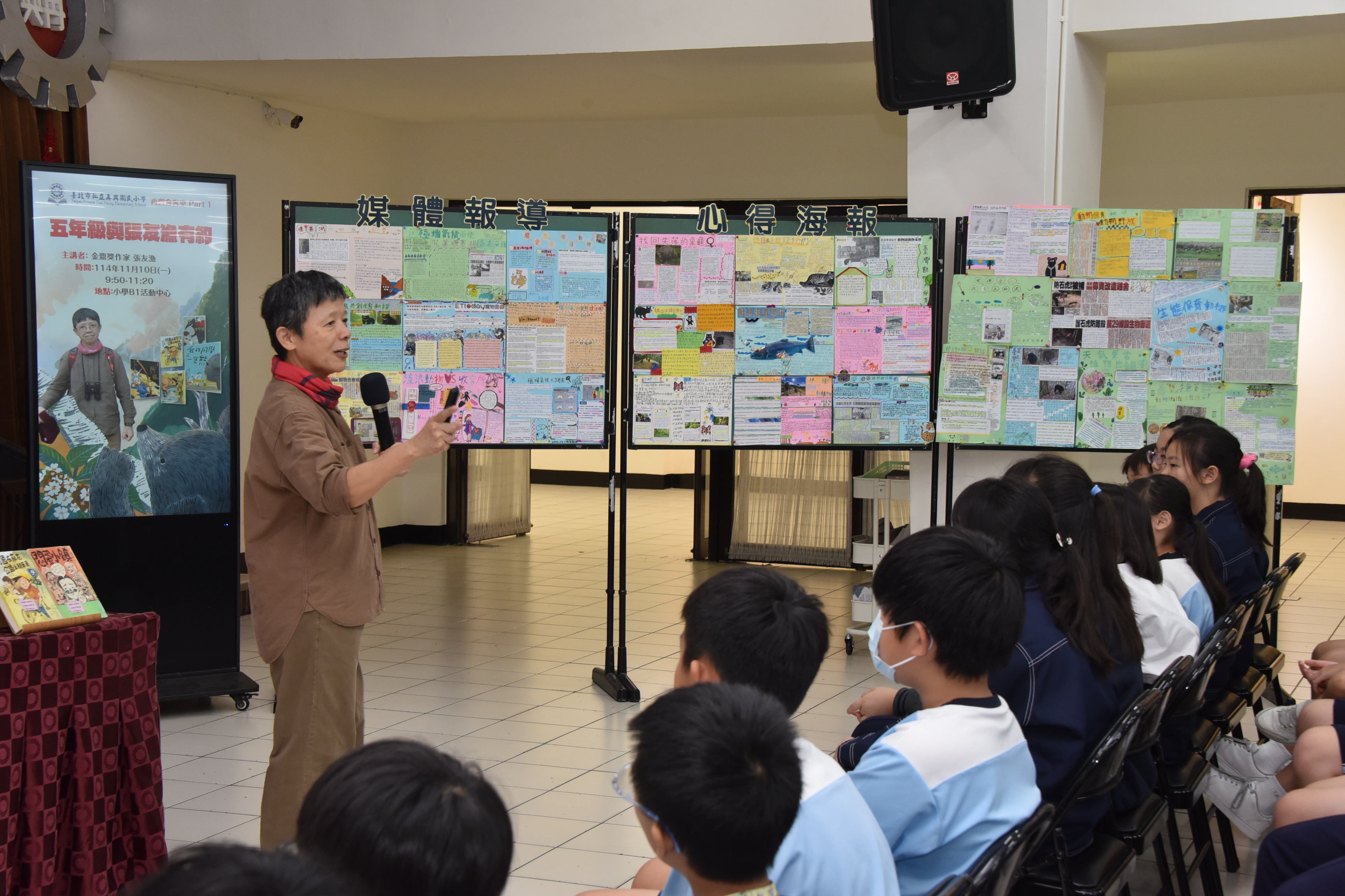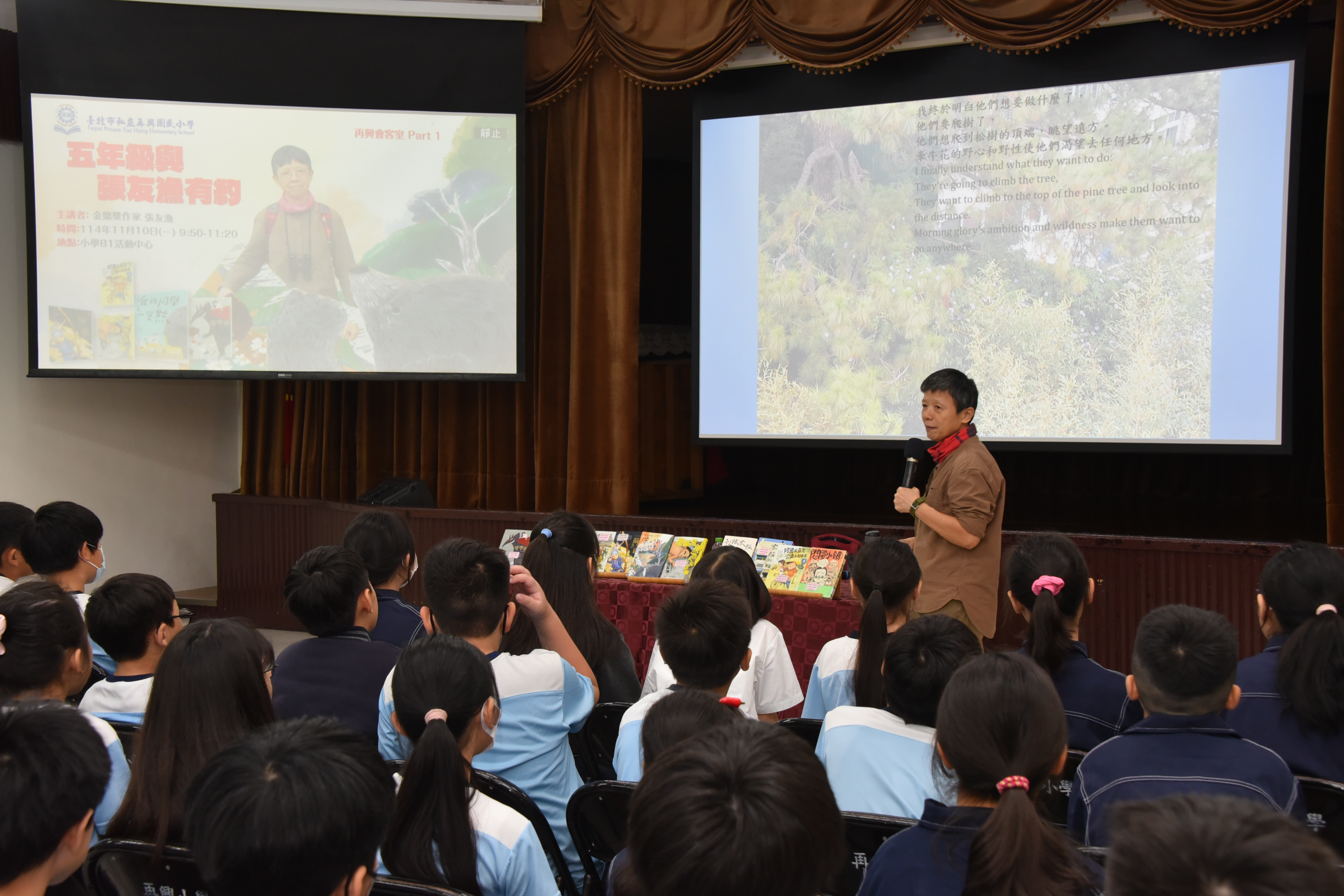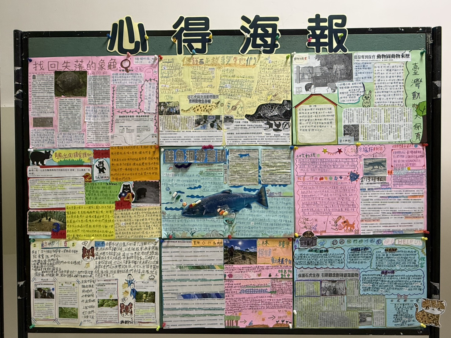五年級的師生們共讀友漁作家的作品《深山裡的同學會》,是《我的同學是一隻熊》的暖心續作,敘述一段關於思念與重逢的動人旅程,更是一部跨越世代,兼具思辨、成長與同理的重量級作品。兩本書的關係在於以臺灣黑熊作為主角,描述牠與人類的互動,引出人與大自然關係的議題,深刻描繪生態保育、人類活動對野生動物的影響,及人與動物之間的共存問題;而續作更進一部呈現臺灣真實的山林多樣的動植物生態,讓讀者遊走於虛實的故事情節之中,反思自己在大自然中的角色,探討如何在保育議題上取得平衡。五年級學生更延伸書中的主題深入探討,透過新聞報導海報製作,深究關注的主題。
