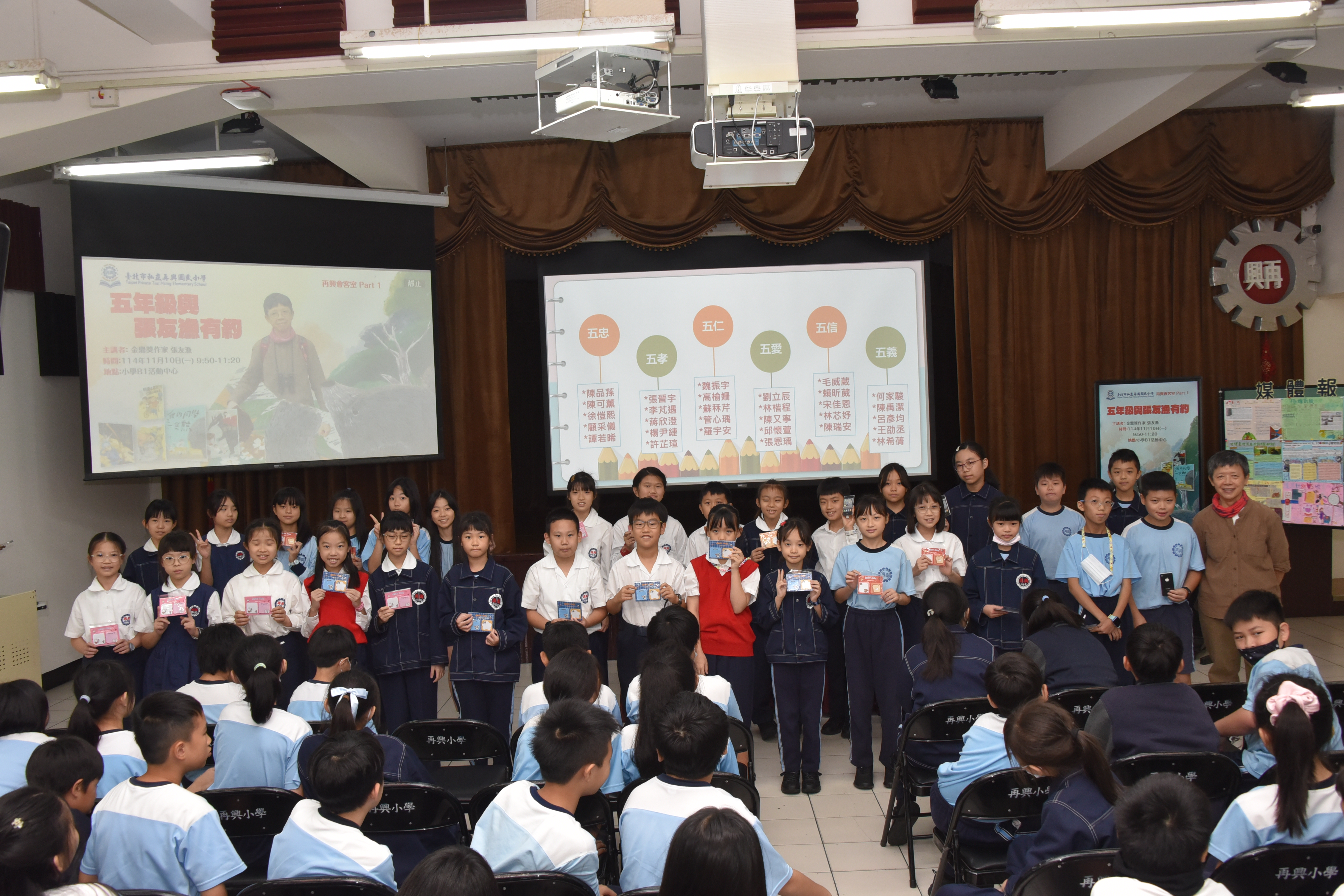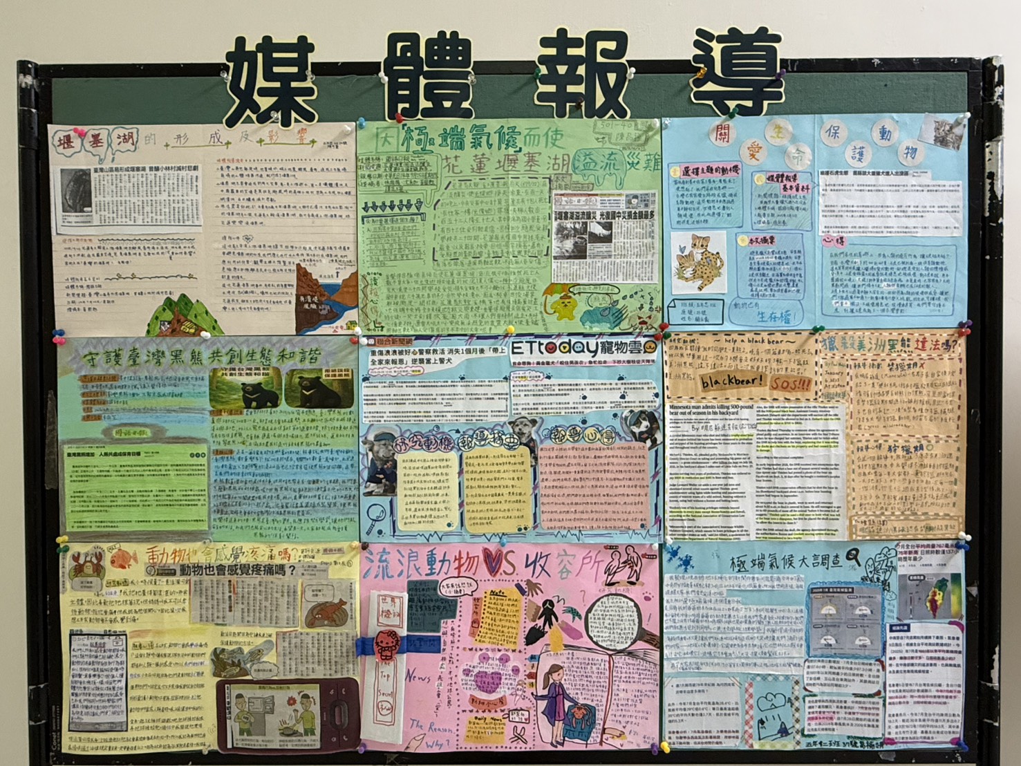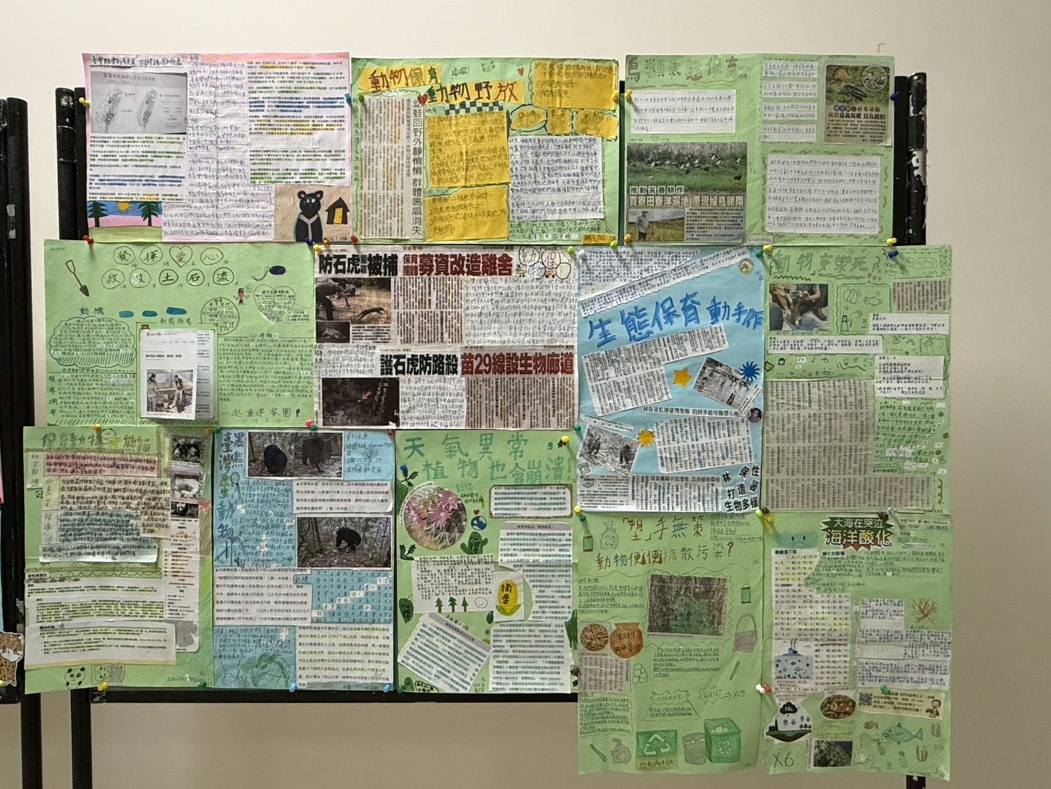 五年級的師生們共讀友漁作家的作品《深山裡的同學會》,是《我的同學是一隻熊》的暖心續作,敘述一段關於思念與重逢的動人旅程,更是一部跨越世代,兼具思辨、成長與同理的重量級作品。兩本書的關係在於以臺灣黑熊作為主角,描述牠與人類的互動,引出人與大自然關係的議題,深刻描繪生態保育、人類活動對野生動物的影響,及人與動物之間的共存問題;而續作更進一部呈現臺灣真實的山林多樣的動植物生態,讓讀者遊走於虛實的故事情節之中,反思自己在大自然中的角色,探討如何在保育議題上取得平衡。五年級學生更延伸書中的主題深入探討,透過新聞報導海報製作,深究關注的主題。