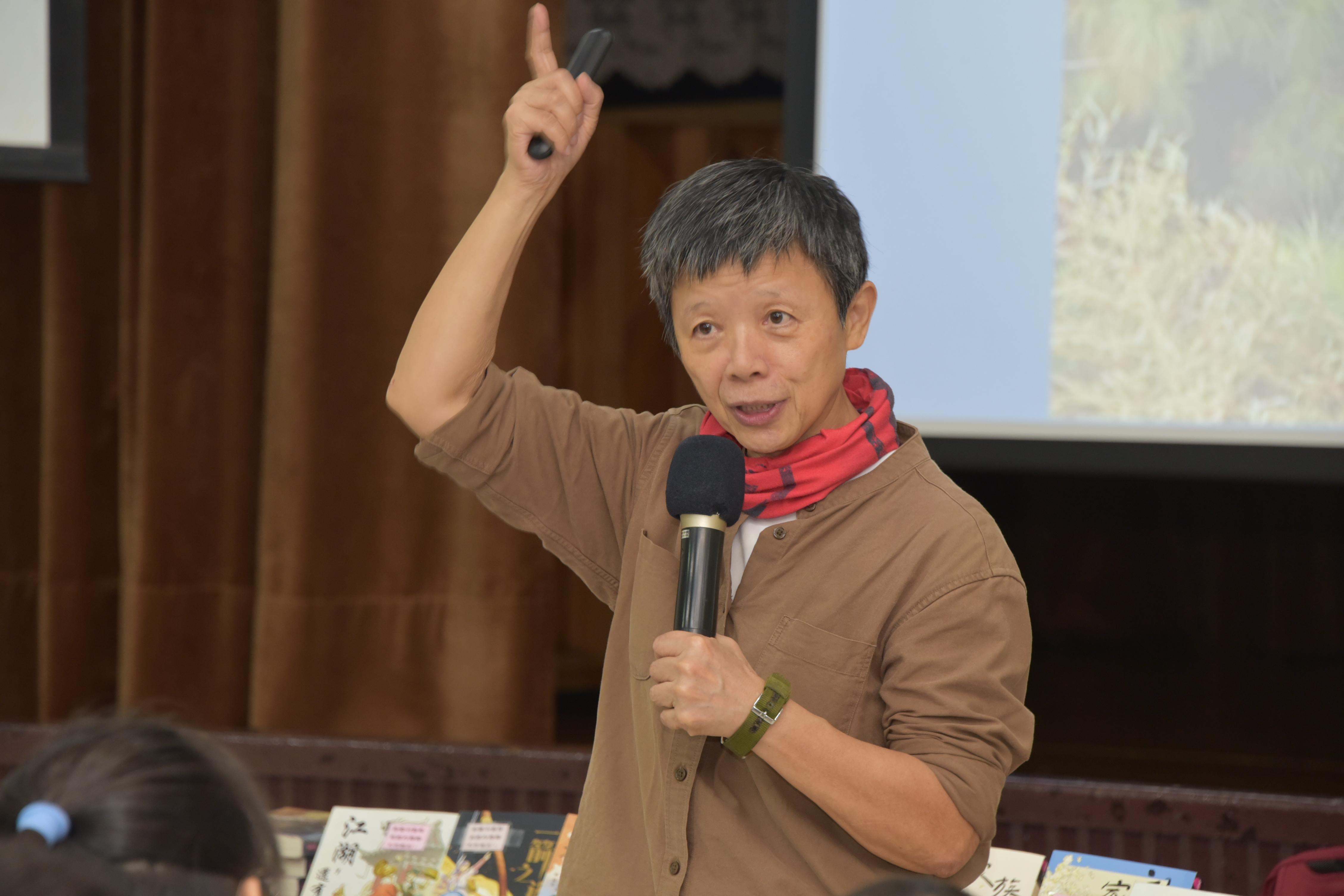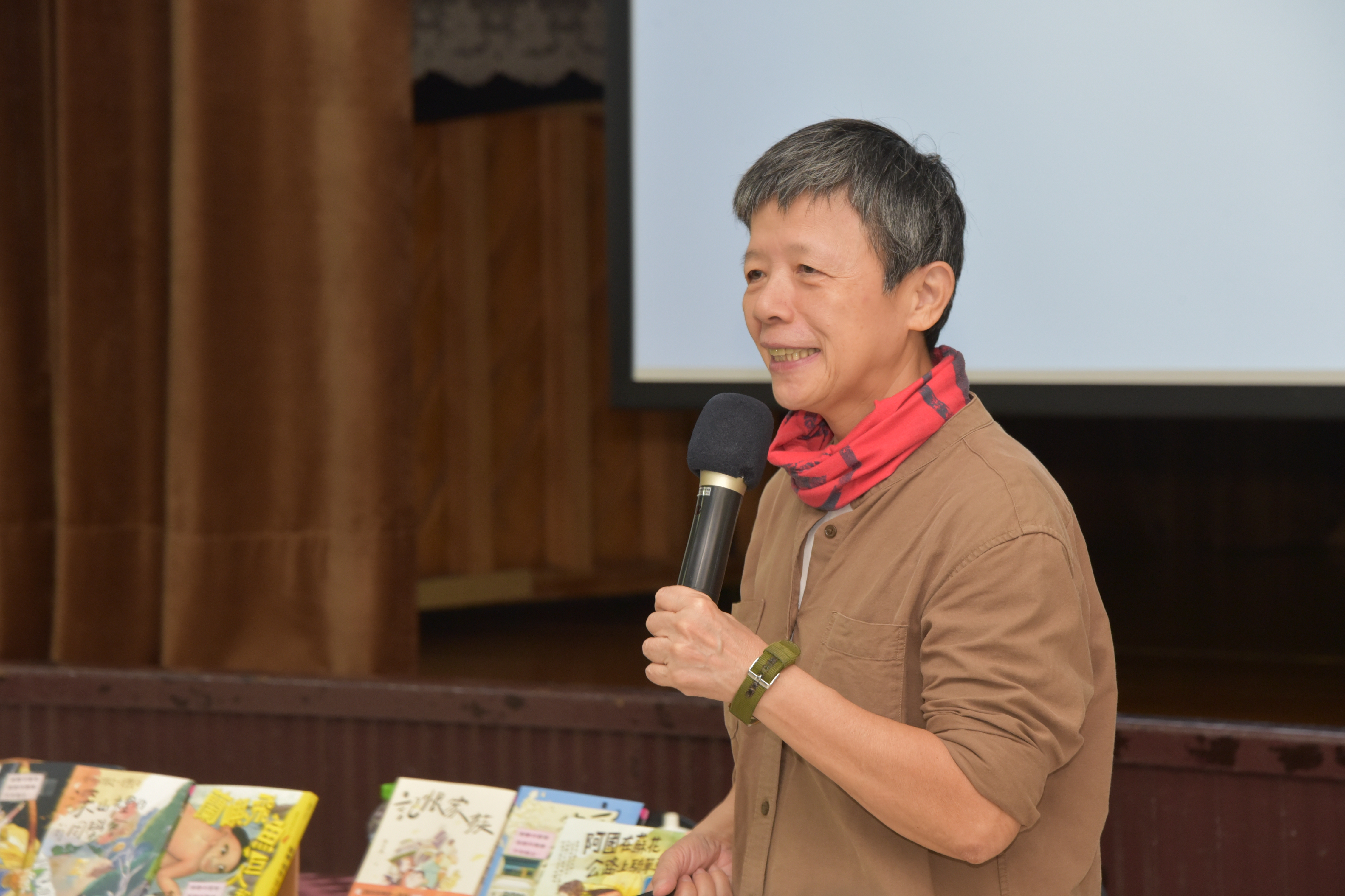 一開場作家和孩子們聊聊自己寫作三十多年以來,發現成為作家的必要條件是能夠主動觀察生活周遭的人事物,並發揮想像力將所見所聞當作寫作素材收納於口袋,日後需要使用時就可以提出參考。她以自己去菲律賓學習英文的一個月中,觀察到牽牛花的攀爬路徑為例,引導孩子們想像牽牛花是有思考能力的,牽牛花計畫攀爬路線,只為爬到樹頂享受陽光、眺望遠方,可見牽牛花的野心和野性使他們渴望去任何地方。藉此經驗勉勵孩子們要主動觀察生活周遭,校園一角、上學或放學途中,甚至有花有草的地方都可能有故事,平時保有童心到處去看看,用好奇心、想像力與創造力面對生活,就能發現人事物不一樣的美麗與奧妙;而一位認真用心的作家,會主動事先做好功課,查詢題材的相關背景資料,再將知識寫到故事裡,像是《深山裡的同學會》的書中有許多動植物的樣貌與特性,都是經過事先調查才能寫出讓讀者身歷其境的感受,增加了讀者的閱讀興趣。