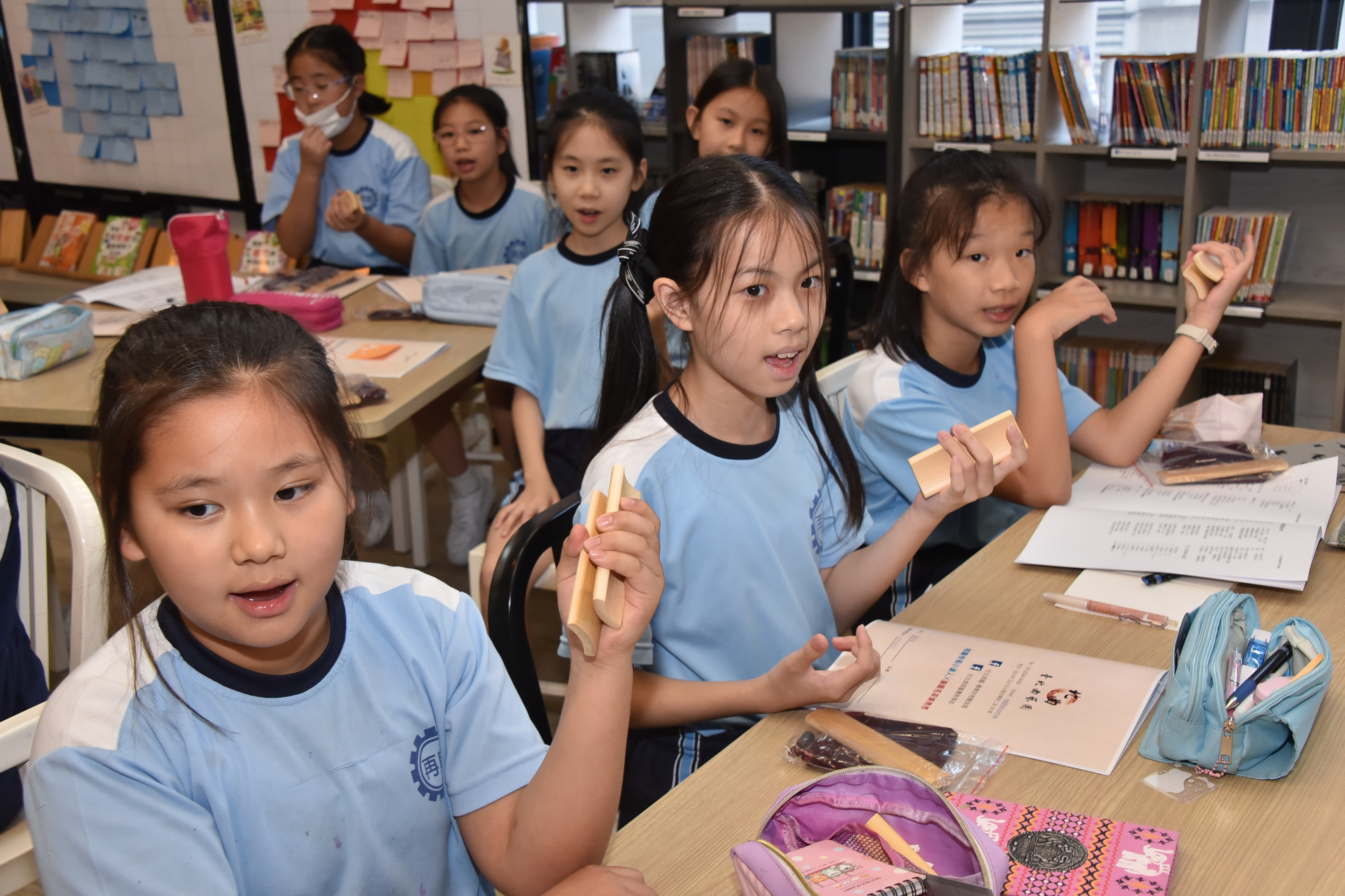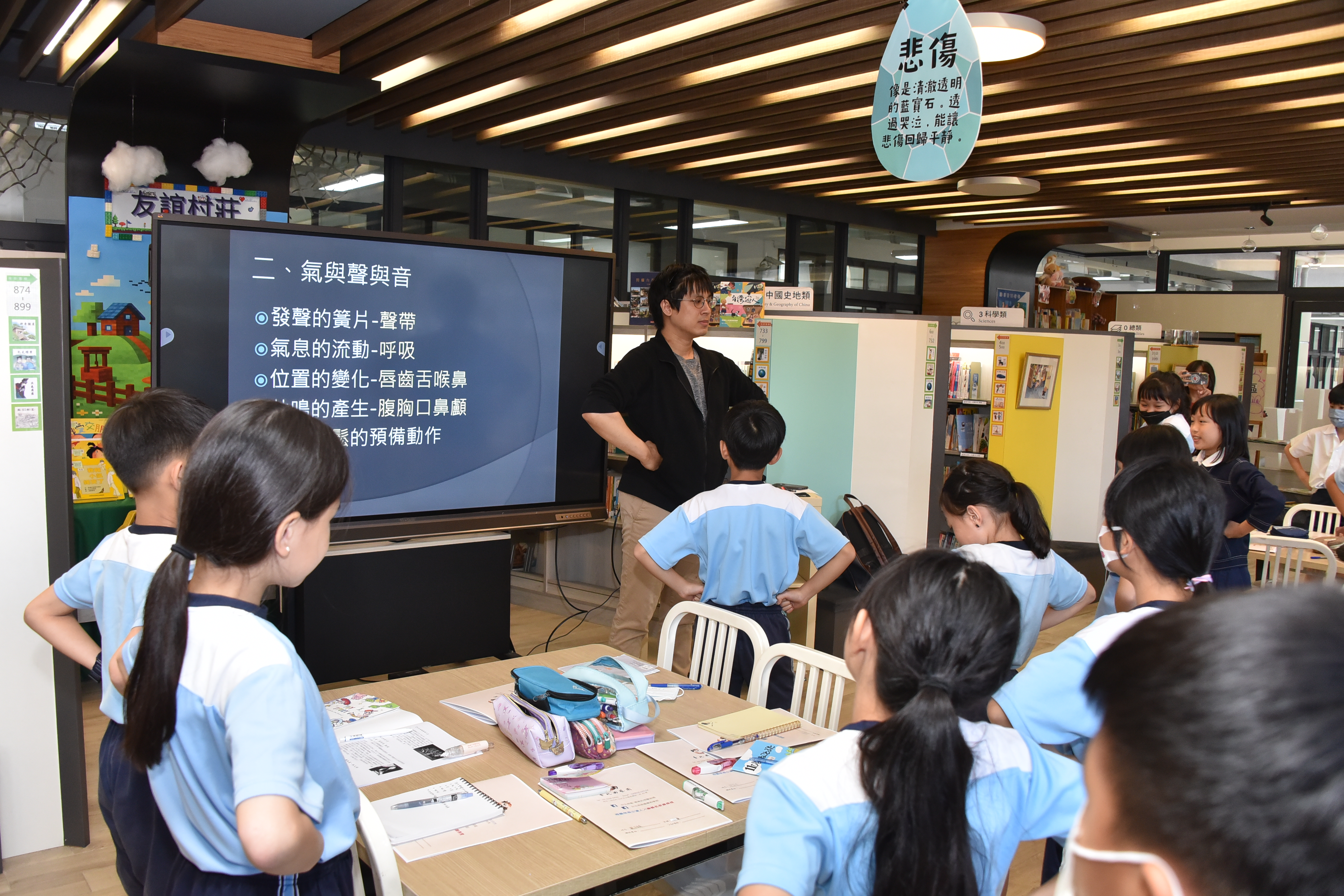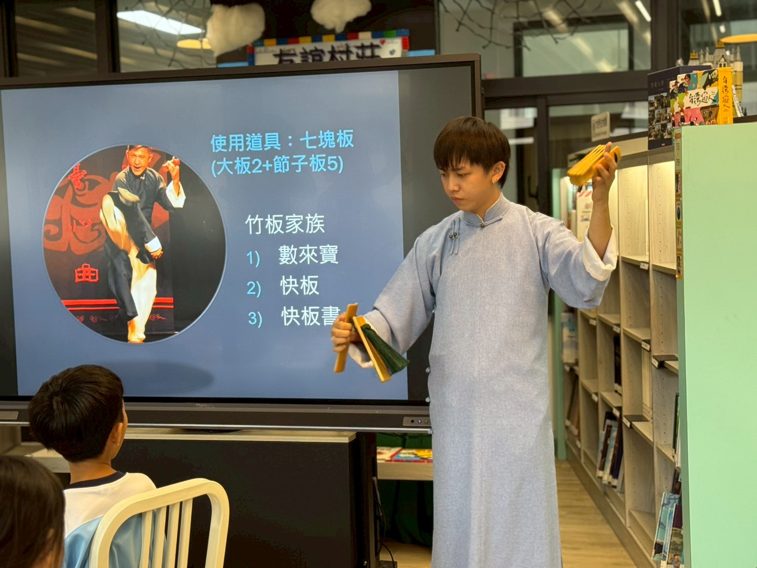 四週的藝術入校活動,每一回都讓學生們徜徉在視覺與聽覺的藝術饗宴中。台北曲藝團的洪子晏老師只要一登場,風趣幽默的言談、豐富的肢體語言,再加上戲感渾然天成的妙語如珠,總讓課堂充滿笑聲,更讓原先以為充滿距離感的傳統說唱藝術,搖身一變成為最新潮又富創意的流行代名詞!當三塊板一上手,架勢一擺,信心馬上加滿油,氣勢瞬間就爆棚!搭配琅琅上口的順口溜,就算是簡單的「一二三四五六七、七六五四三二一」,都瞬間充滿了節奏與韻律感,讓人眼睛一亮、讚不絕口!