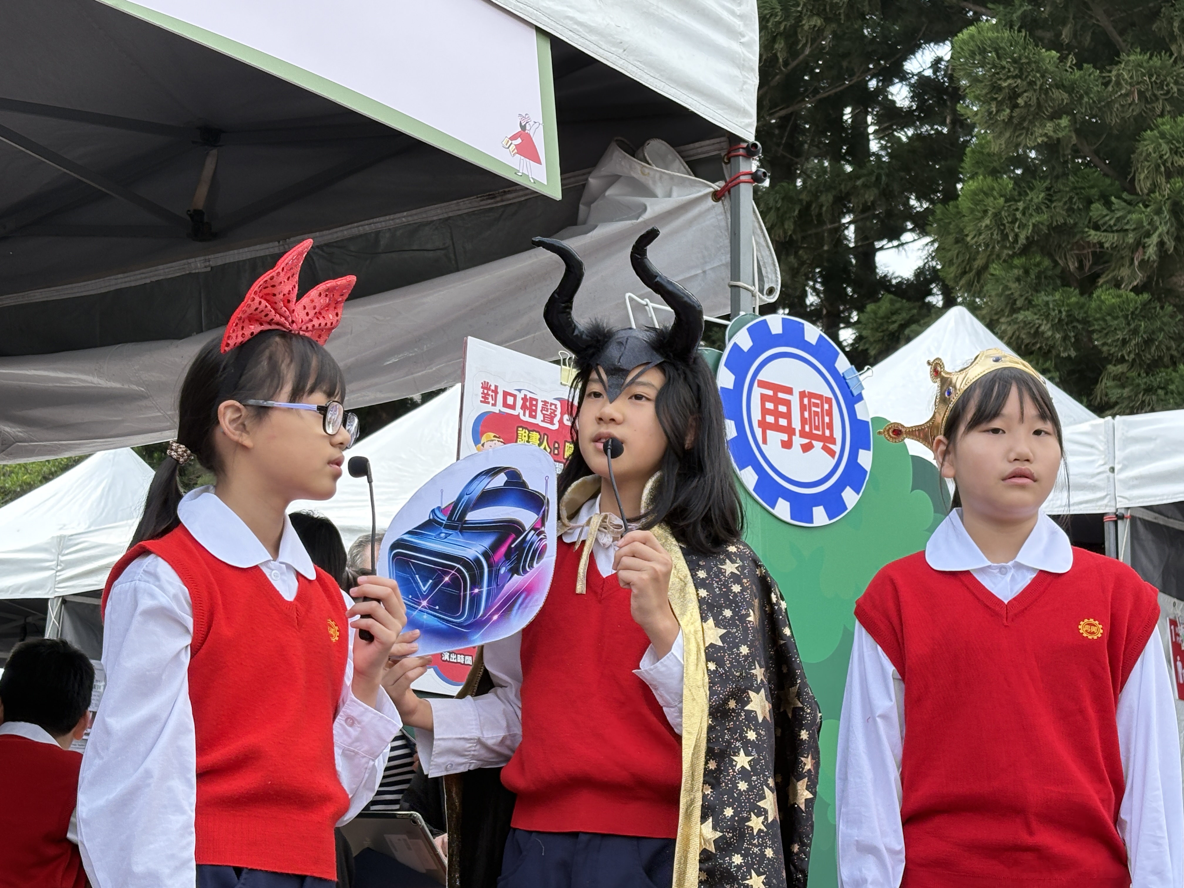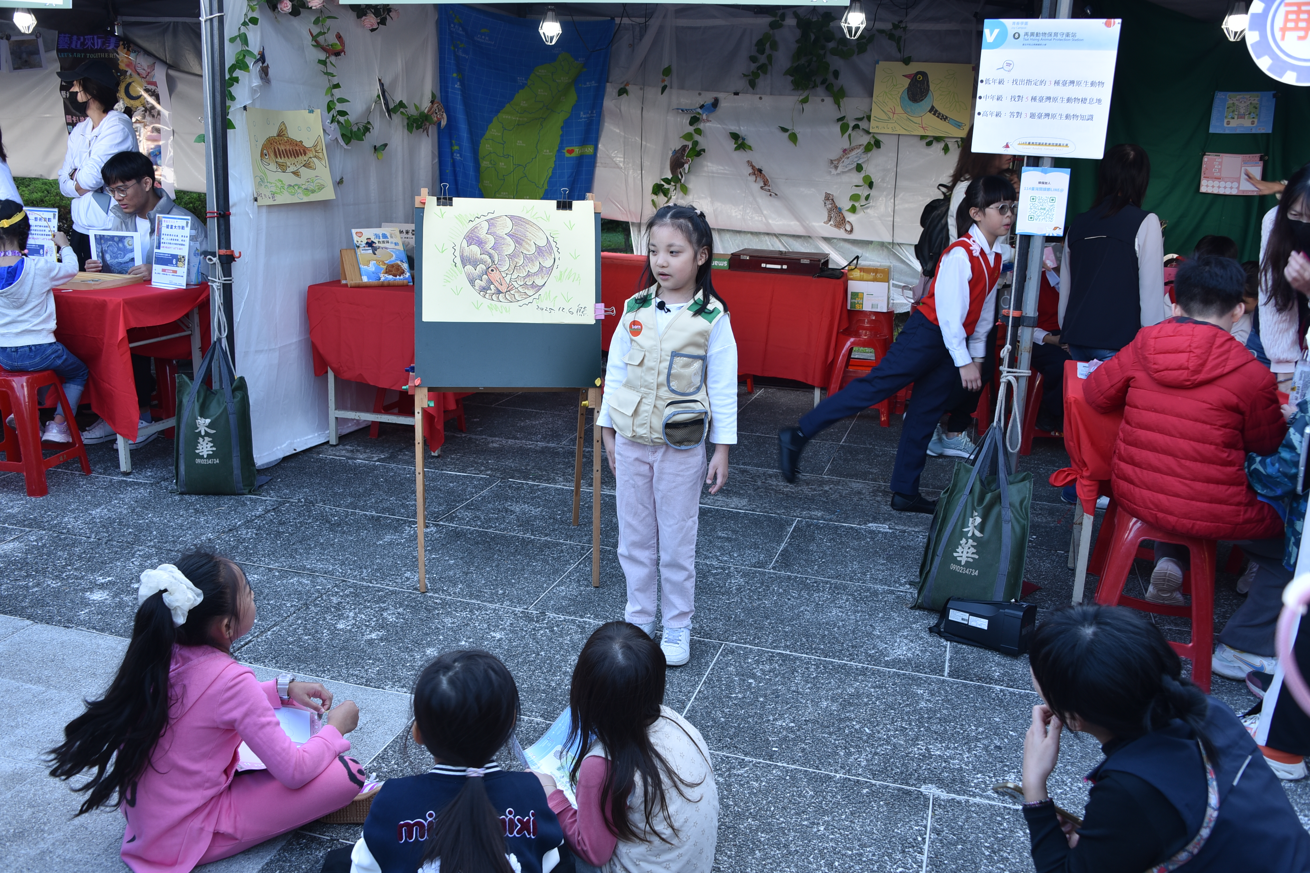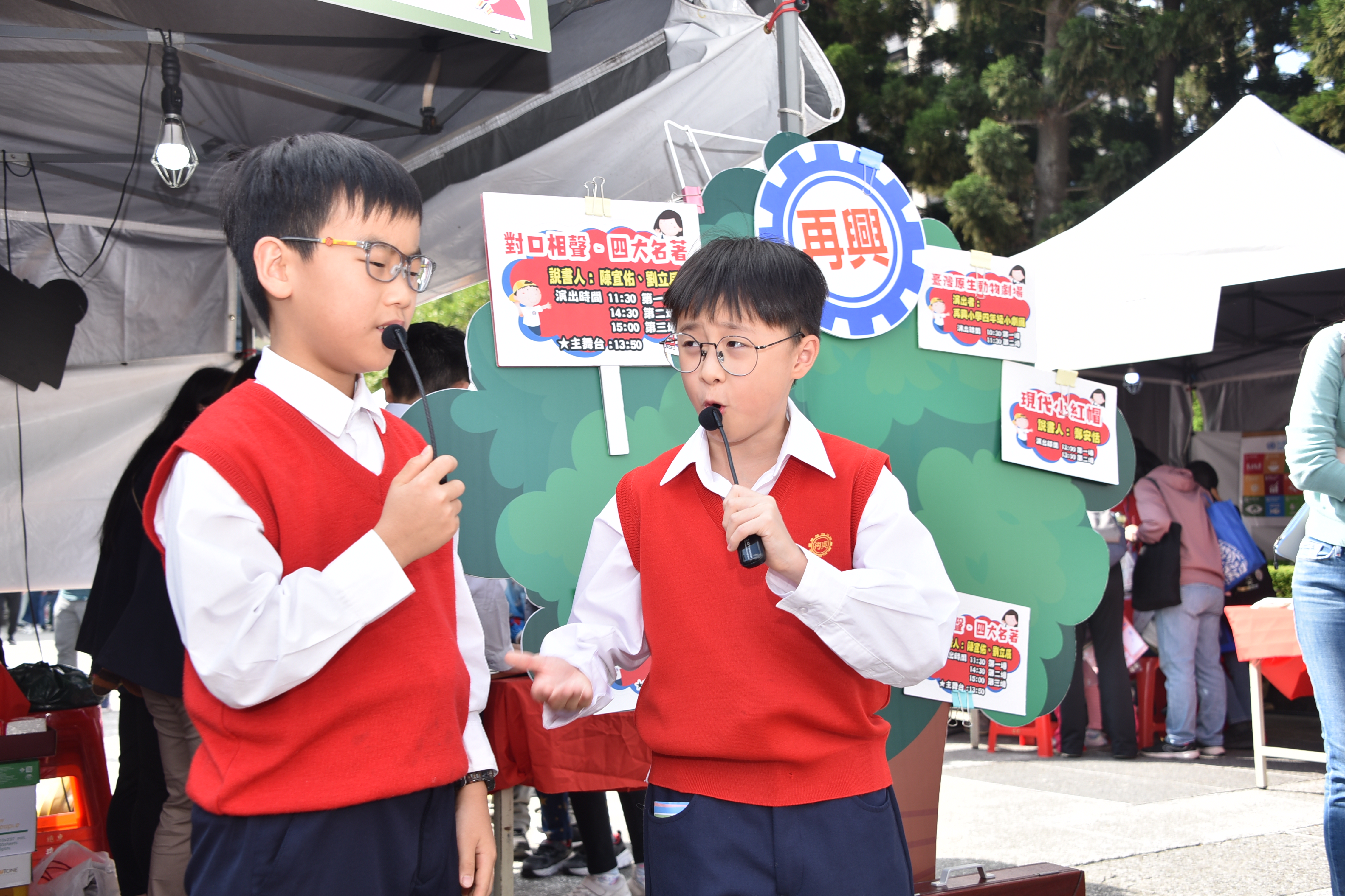 每個整點的學生演出,是攤位周圍最熱鬧的時刻,今年展演內容多元,結合語文、戲劇、閱讀理解與生態議題。《台灣原生動物劇場》以戲劇呈現棲地破壞與保育行動。小小說書人系列-《現代小紅帽》融入媒體識讀與安全意識;《穿山甲保育》由中英文說書輪番呈現:從科普繪本中取材,現場以紙芝居街頭說書,知性中再帶點感性介紹穿山甲的生態與保育,英文說書除了帶大家認識穿山甲,現場還進行了英語教學,教大家認識穿山甲的英文「pengolin」寓教娛樂;《白雪公主的自我保護課》結合性平與自我保護教育,公主不只是美麗也會保護自己;對口相聲《四大名著》展現學生口語表達、語感節奏與語文底蘊。舞台前笑聲、掌聲不斷,家長與民眾也在孩子自然大方的演出中,看見再興多元閱讀課程的深度與成果。