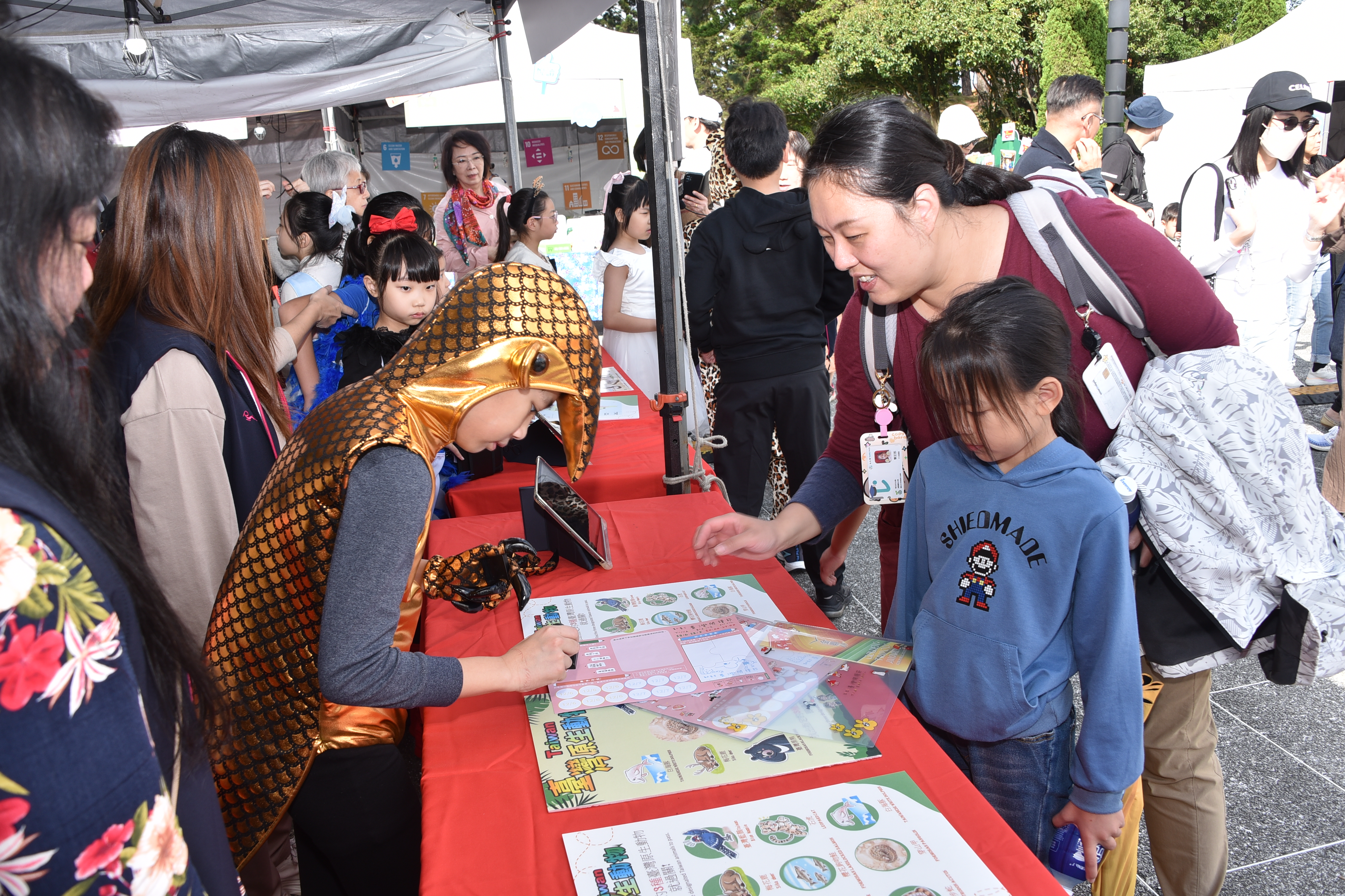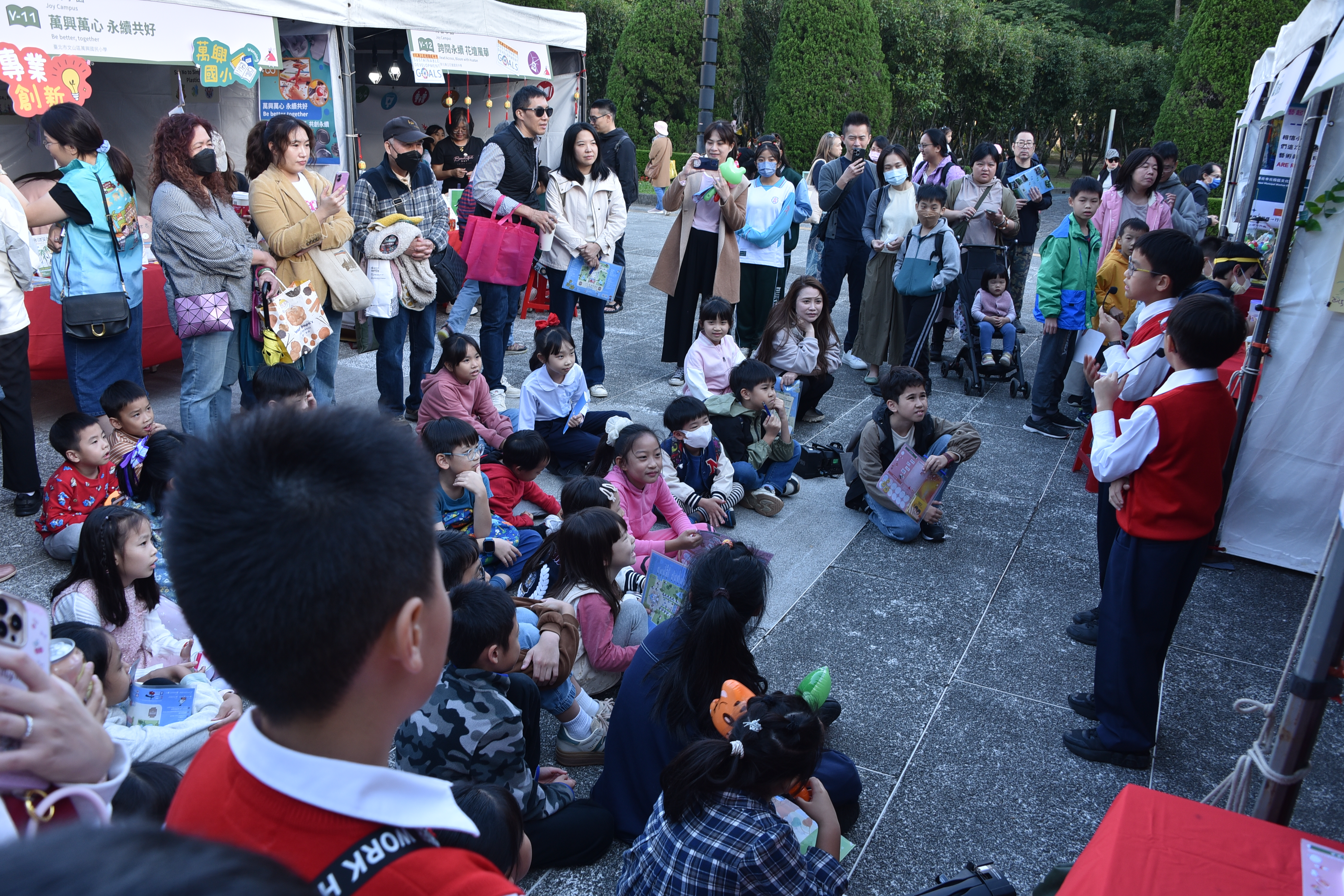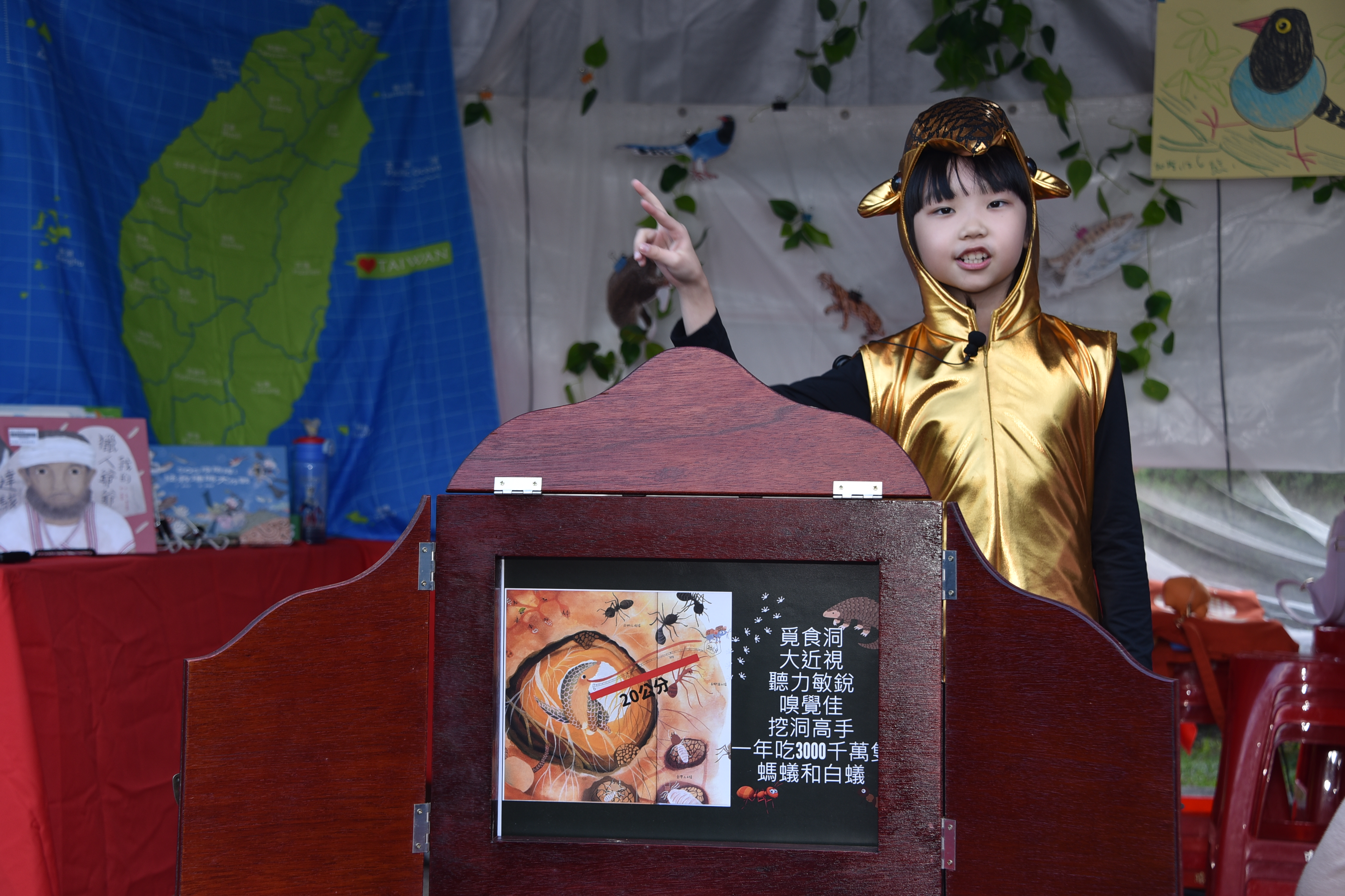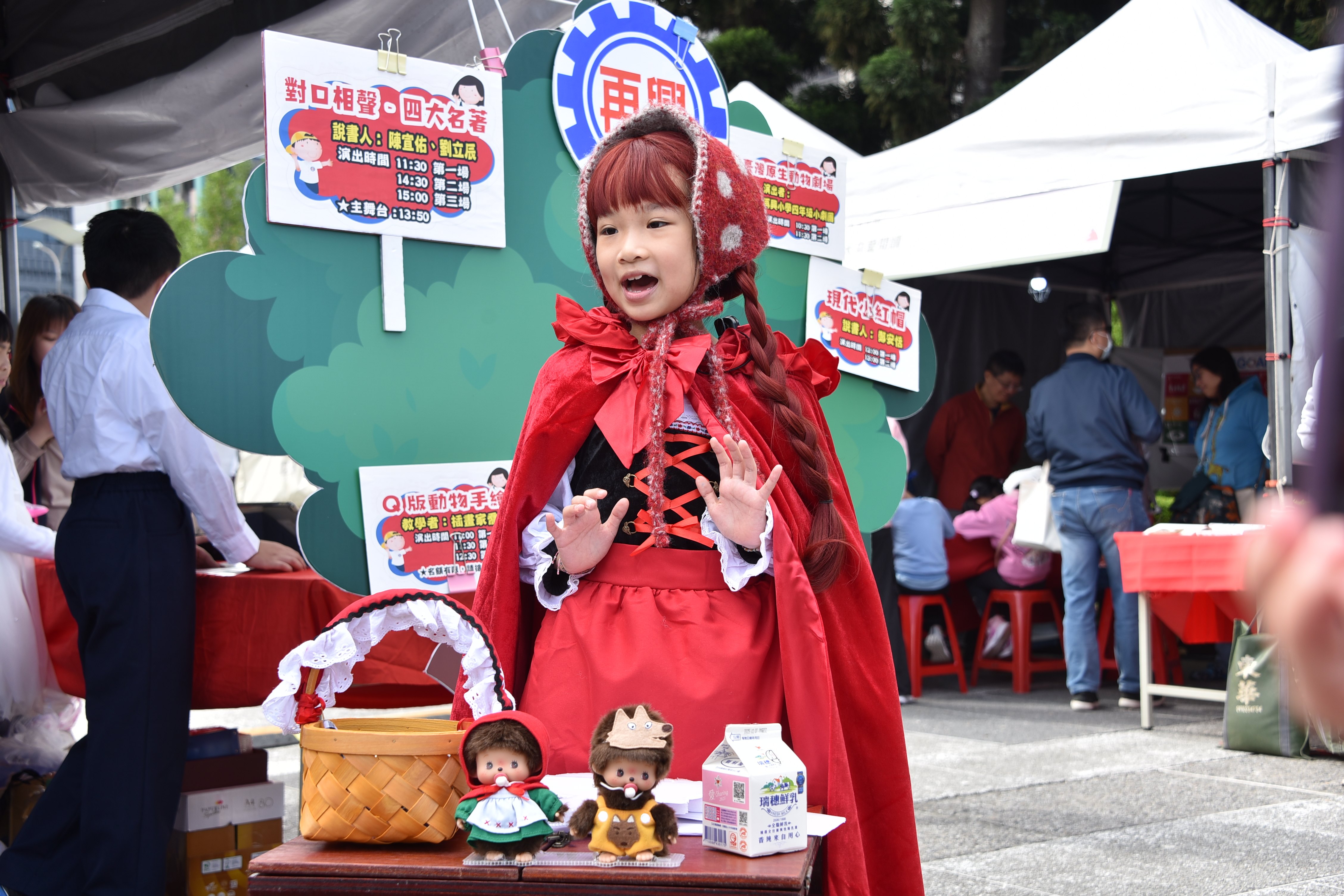 每個整點的學生演出,是攤位周圍最熱鬧的時刻,今年展演內容多元,結合語文、戲劇、閱讀理解與生態議題。《台灣原生動物劇場》以戲劇呈現棲地破壞與保育行動。小小說書人系列-《現代小紅帽》融入媒體識讀與安全意識;《穿山甲保育》由中英文說書輪番呈現:從科普繪本中取材,現場以紙芝居街頭說書,知性中再帶點感性介紹穿山甲的生態與保育,英文說書除了帶大家認識穿山甲,現場還進行了英語教學,教大家認識穿山甲的英文「pengolin」寓教娛樂;《白雪公主的自我保護課》結合性平與自我保護教育,公主不只是美麗也會保護自己;對口相聲《四大名著》展現學生口語表達、語感節奏與語文底蘊。舞台前笑聲、掌聲不斷,家長與民眾也在孩子自然大方的演出中,看見再興多元閱讀課程的深度與成果。