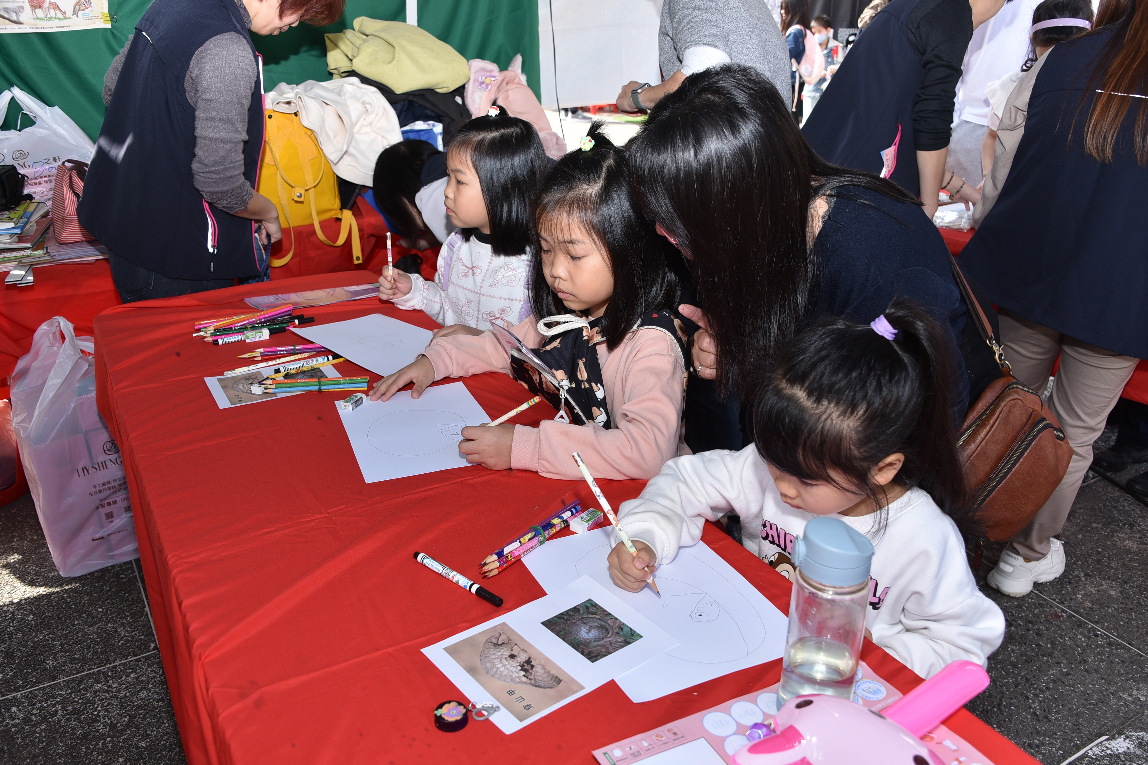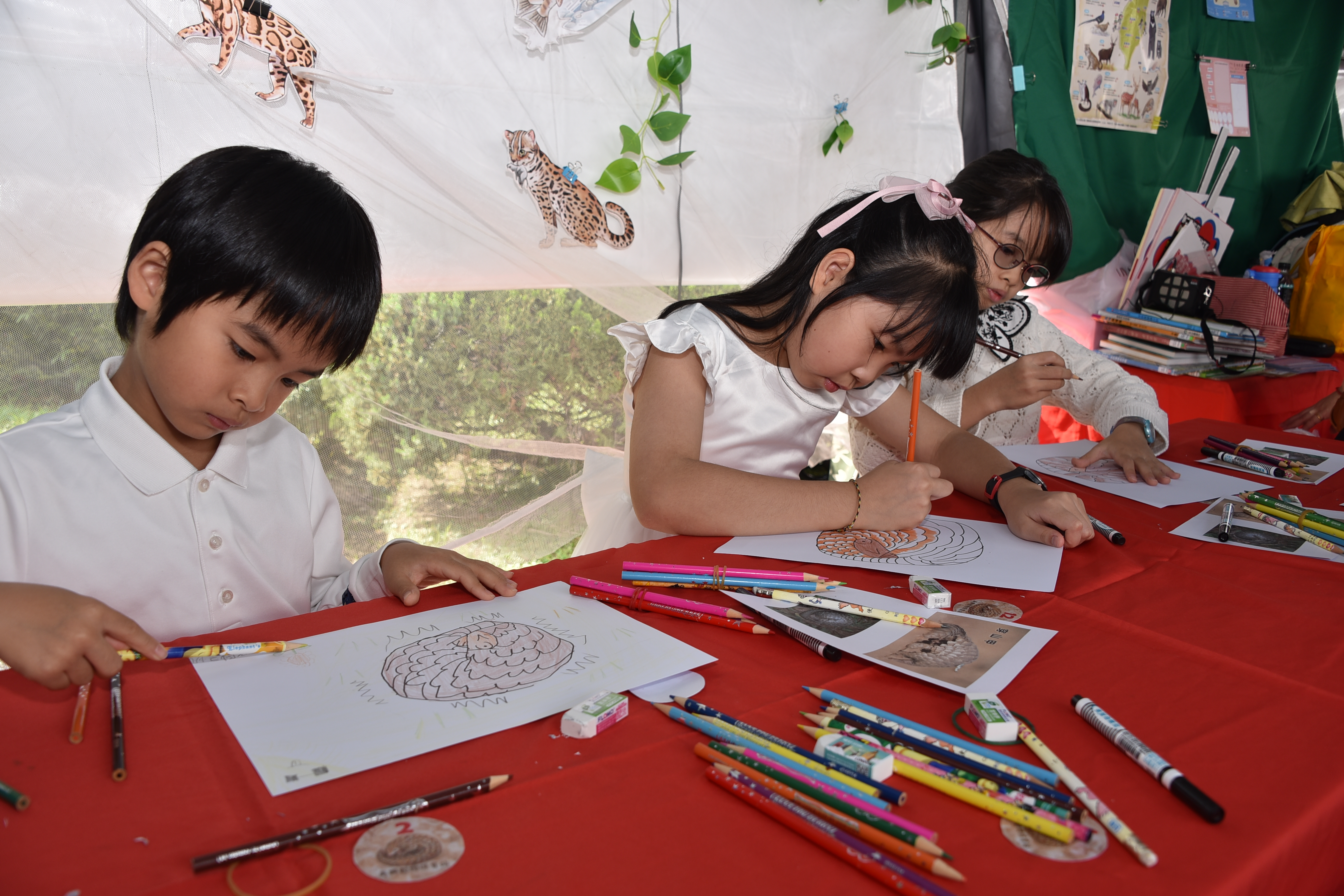 活動特邀《臺灣原生動物說故事》系列書籍的插畫家喬於現場指導孩子手繪Q版穿山甲、臺灣藍鵲與櫻花鉤吻鮭。孩子們專注地描線、上色,將自己最喜歡的動物記錄在小小畫紙上。這不只是美術創作,更以「畫中學、學中畫」的方式深化學生對物種外型與特徵的理解。