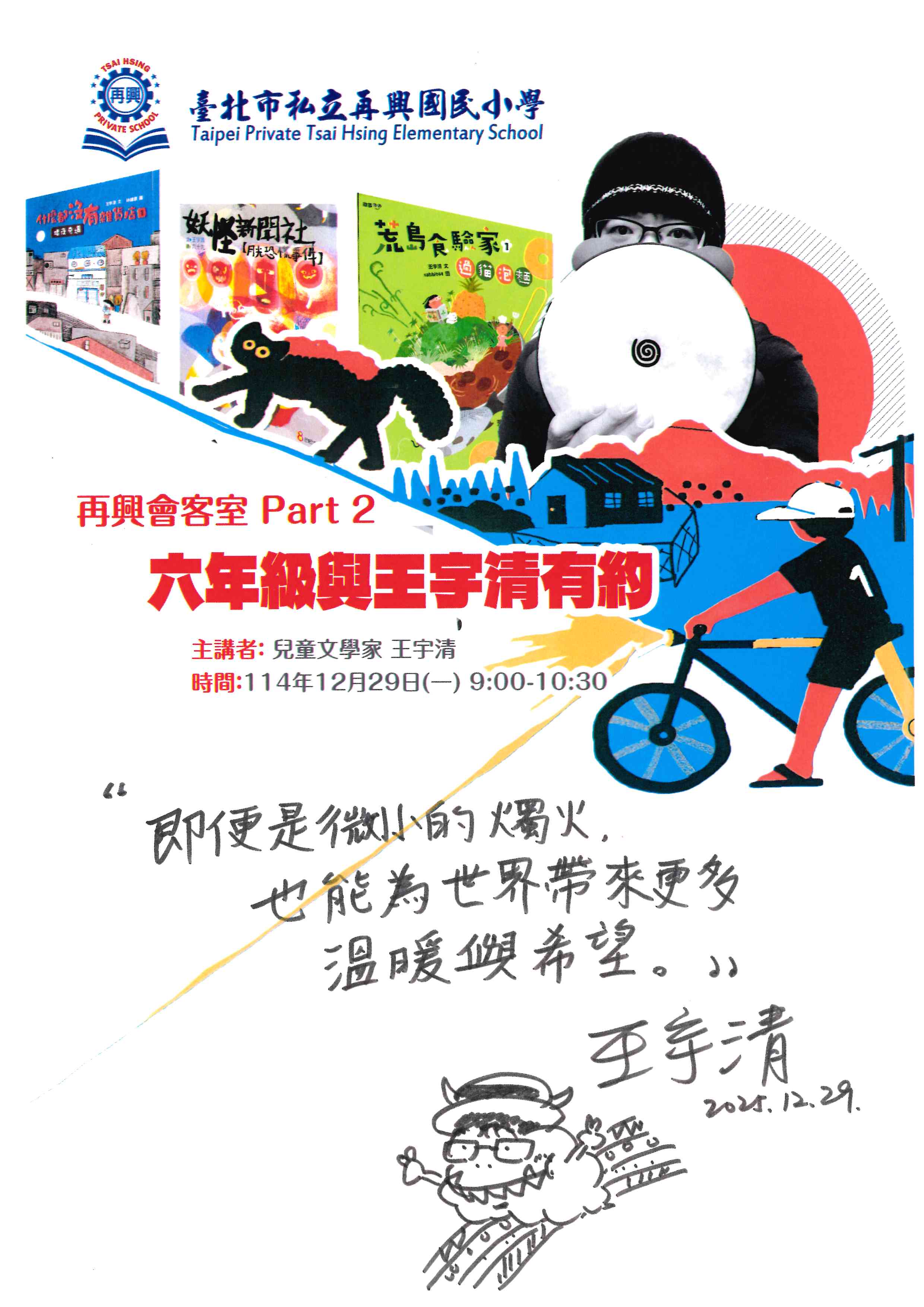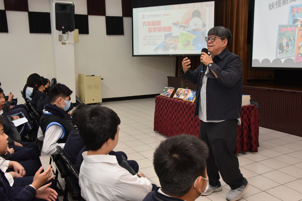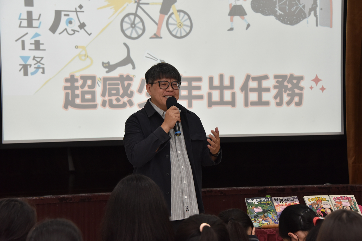 在本學期六年級的共讀書「超感少年出任務」中,貼近生活的角色場景、接地氣的敘述口吻,及隱隱約約透露出來的詭譎氣氛......都讓學生一開始翻閱便被深深吸引,更欲罷不能的想忍不住一口氣看完一探究竟。12月29日上午,學校特別邀請作者王宇清老師蒞校,和學生們聊一聊創作此書的起心動念與分享所見所聞。