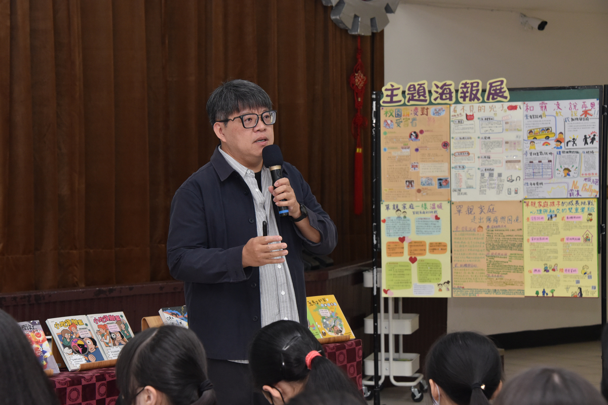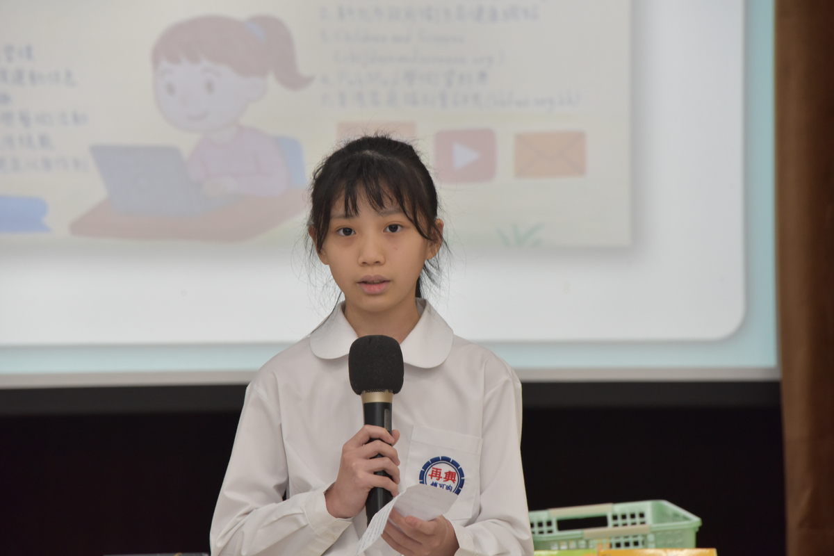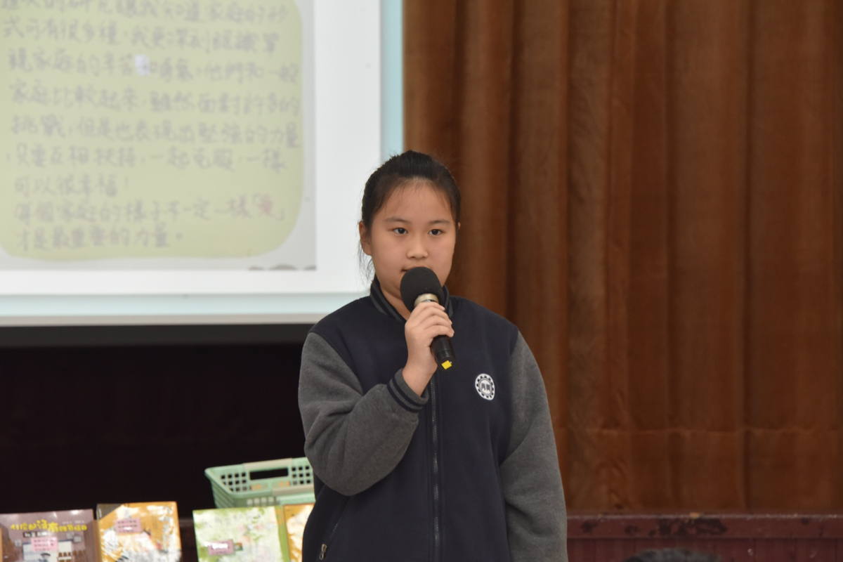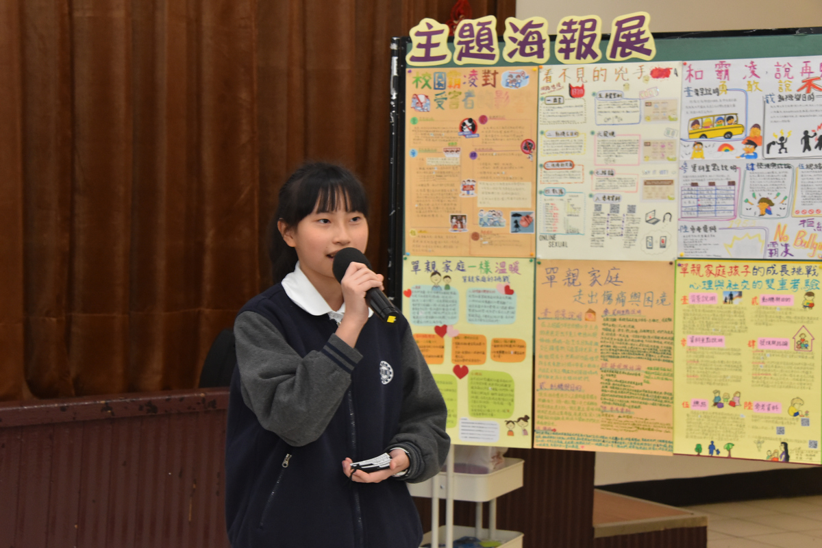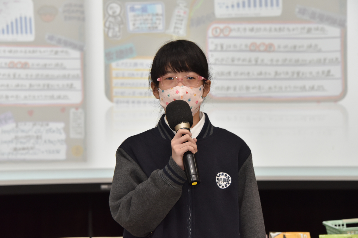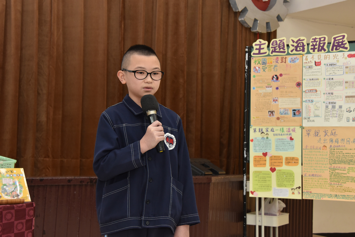 六年級學生除了共讀「超感少年出任務」外,更根據書中提及如單親家庭、獨居老人、網路成癮等議題做進一步探討並製作小論文海報。各班優良作品五位學生除了由王老師親自頒發小禮物獎勵外,並請各班代表向大家分享海報製作內容與心得。忠班語暄、孝班衍妍、愛班芬誼分享單親家庭面臨的困境,需要大家一同理解與包容;仁班可昀、信班楀鈞分享網路成癮的影響與預防;義班若晴分享政府對高齡長者的福利措施。期盼透過共讀、課堂討論與議題探討,能讓學生們對社會上需要關注的弱勢團體多一分重視,行有餘力之時,更能當一個手心向下的人,為他人貢獻一分心力與支持!