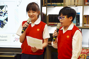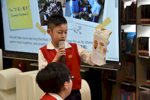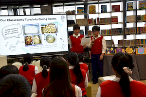 活動中,孩子們不只近距離認識國際作家,也從熟悉的校園生活出發,自信的用英文向珮思老師介紹再興小學獨具特色的營養午餐文化。從每天在教室裡享用熱騰騰的午餐,到分工合作的打菜服務,再到多元文化週的世界料理體驗,孩子們分享的不只是「吃什麼」,更是在述說一種生活教育、一種文化經驗,也是一段從日常走向世界的學習歷程。 在交流過程中,學生也談起屬於再興的午餐記憶。例如校友們耳熟能詳的「再興方塊肉」,雖然因選用低脂瘦肉,口感較有嚼勁,卻也因此成為許多人共同的校園印象,孩子們還熱情推薦珮思老師一定要品嚐。珮思老師則分享,美國並不是每一所學校都提供營養午餐,不論是學校供應或自行準備,多半以冷食為主,最常見的是三明治;但因為女兒喜歡吃熱食,她也會特別準備保溫罐料理。這些來自不同校園日常的小故事,不僅拉近了彼此距離,也讓文化交流多了一份真實與親切。