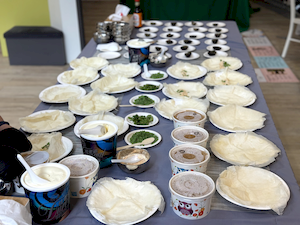 活動最後,師生從珮思老師的第一本書《醜蔬菜湯》(The Ugly Vegetable Soup)發想,以充滿創意的方式,呈現對「融合料理(Fusion Cuisine)」的理解,嘗試將香菜玉米餅搭配花生冰淇淋潤餅、皮蛋和蚵仔麵線,以新奇有趣的組合展現對飲食文化的開放與想像。這份帶著實驗精神的創意,不只引發大家對全新味覺的驚喜,現場「好吃!」的聲音此起彼落,就連原本有些排斥香菜氣味的學生,也開始願意嘗試看看。文化差異的接納與再創造,就這樣在味蕾和對話之中自然發生。珮思老師也覺得十分新鮮,還特地帶了香菜口味的巧克力,準備與女兒一起分享這份特別的臺灣記憶。
