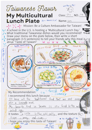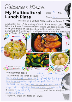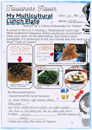 接著,學生們進一步分享,如果美國學校也要辦理「臺灣特色營養午餐」,最值得推薦的菜色會是什麼。孩子們依照臺灣學校營養午餐常見的配置,從主食、主菜、副菜到湯品,發表自己心中的臺灣味。滷肉飯、炒飯、擔仔麵、炒米粉、水餃、牛肉麵、炸雞排、鹽酥雞、香煎虱目魚、麻油雞、臭豆腐、炒高麗菜、炒水蓮、蘿蔔排骨湯、魚丸湯與四神湯等,都在推薦名單之中。珮思老師回應,牛肉麵、水餃、炒飯和魚丸湯應該會是美國學生很容易接受、也可能喜歡的味道,對孩子們的推薦內容相當感興趣,也表示想要仔細閱讀大家的學習單。