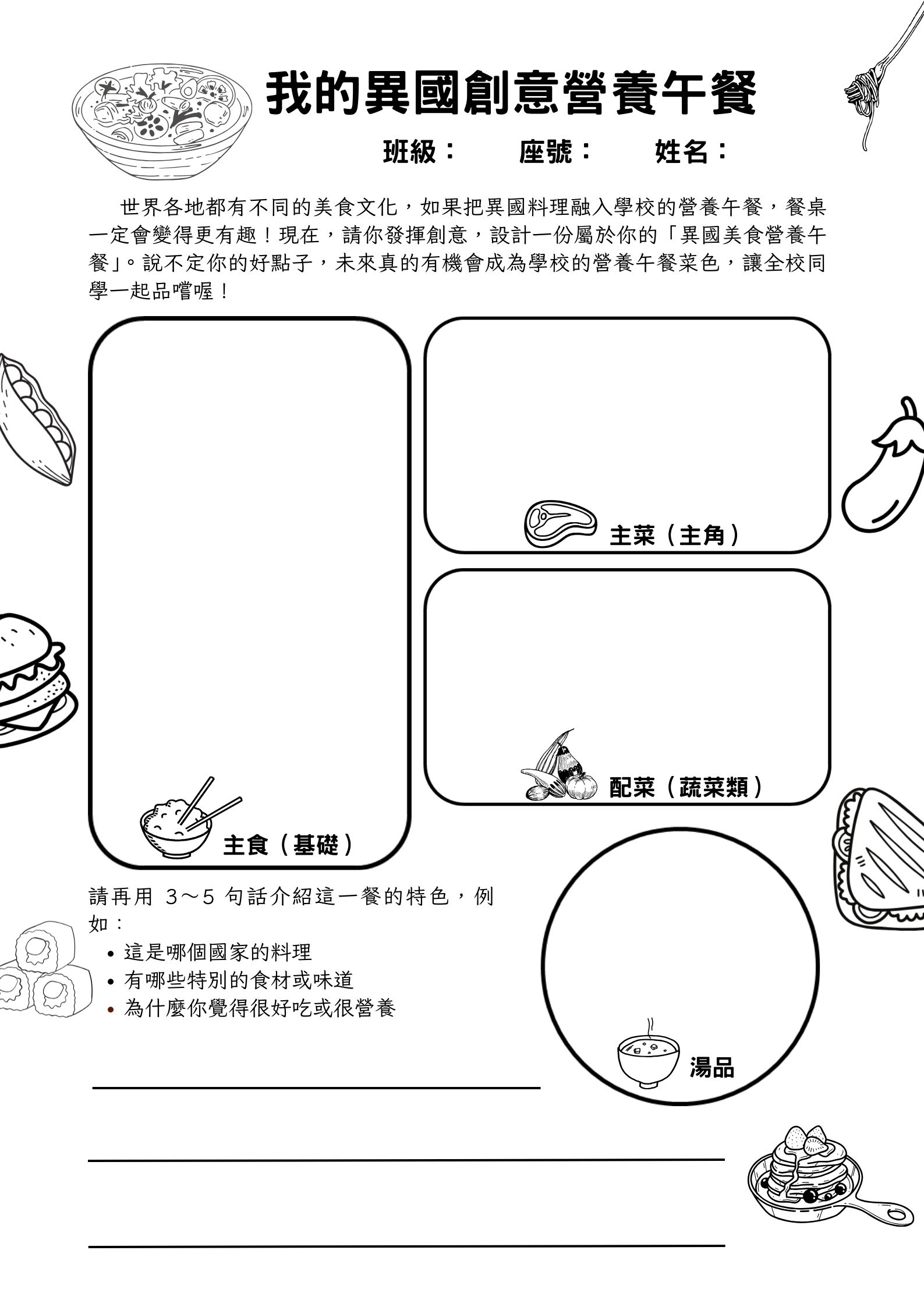 此外,輔導室也設計了「我的異國創意營養午餐」學習單,鼓勵學生發揮發揮創意,設計心目中的理想午餐菜單,並思考其所蘊含的文化元素。創意作品未來更有機會作為學校營養午餐菜色設計的參考,讓學生的想法有機會實際呈現在餐桌上,提升參與感與成就感。 |