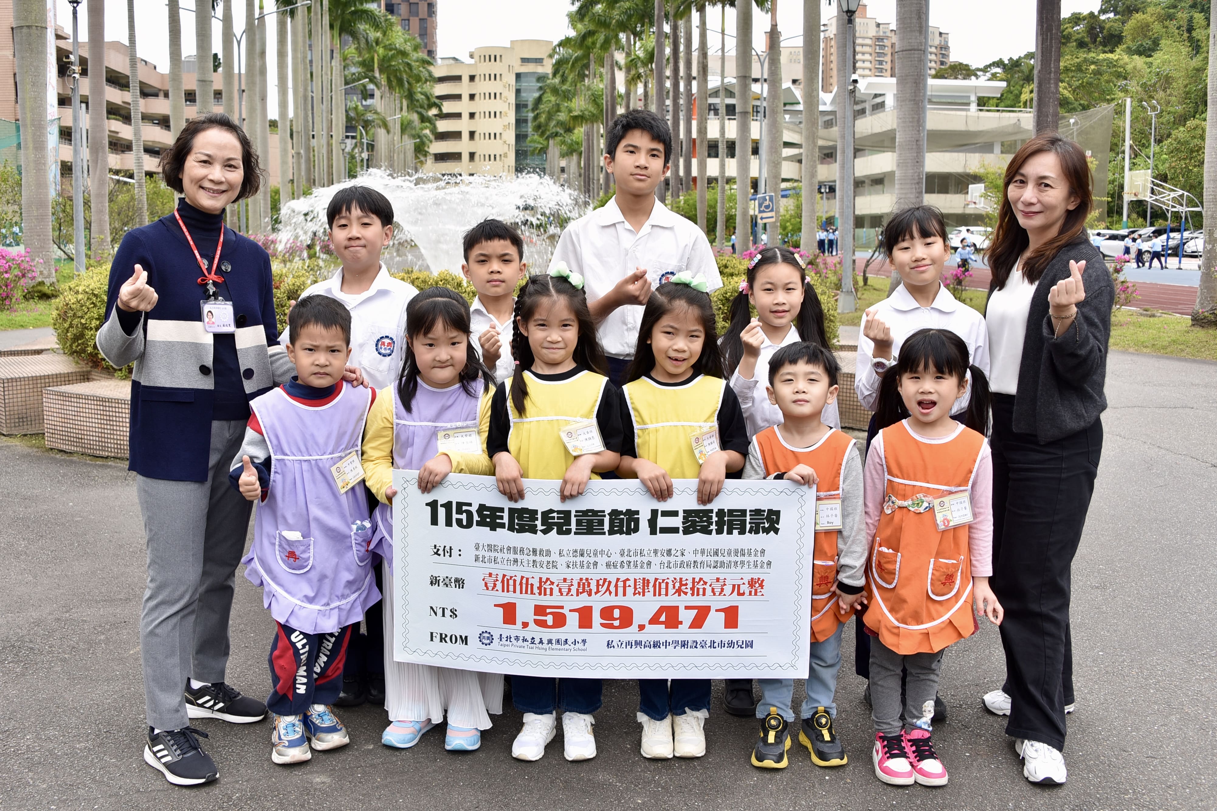 仁愛捐款,傳承一甲子的愛 源自創辦人朱秀榮博士於民國48年發起的仁愛精神,至今已延續超過一甲子。今年全校師生與幼兒園共同響應,共募集 1,519,471元 善款。學生在家庭的引導下,將壓歲錢與零用錢轉化為助人的實際行動。善款除持續支持臺大醫院社會服務急難救助、德蘭兒童中心及馬偕醫院兒童燙傷基金會外,今年更首度捐助「台北市政府教育局認助清寒學生基金會」,讓愛的力量透過教育持續延伸。 公民實踐,微夢想團隊的氣候行動 本校「微夢想團隊」以「氣候行動」為核心,展現了卓越的跨域學習成果。學生們結合了雙語學習、數位創作與多文本閱讀,深入探討極端氣候對世界的影響,並合力創作出「雙語有聲電子繪本」,將節能減碳的意識由校園推向家庭與社區。
